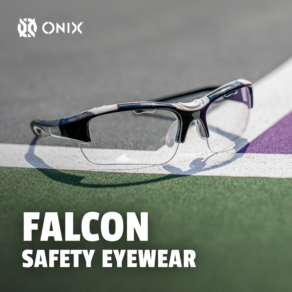 The ONIX Pickleball Falcon Eyewear safety glasses are built to withstand the rigors of competitive pickleball play. The glasses feature 99.9% UV sun protected and durable anti-scratch/anti-fog treated lenses. The set includes three lenses color options — clear, smoke, and blue tint. Soft non-slip nose pieces add comfort and the soft ear pads provide a secure fit while you play. The Falcon Eyewear protective safety glasses also include an adjustable elastic strap and a microfiber storage pouch. Lenses: Polycarbonate material; Frames: Nylon material; Nose piece & side arm padding: TRP/ Rubber. All eyewear models meet/exceed ASTM F803-11 impact standard. Dimensions: lens width – 6.7cm, lens height – 3.7cm, temple length – 11.5cm, overall width – 14.7cm.