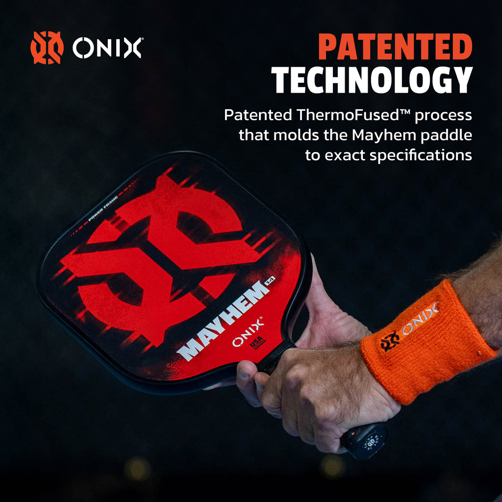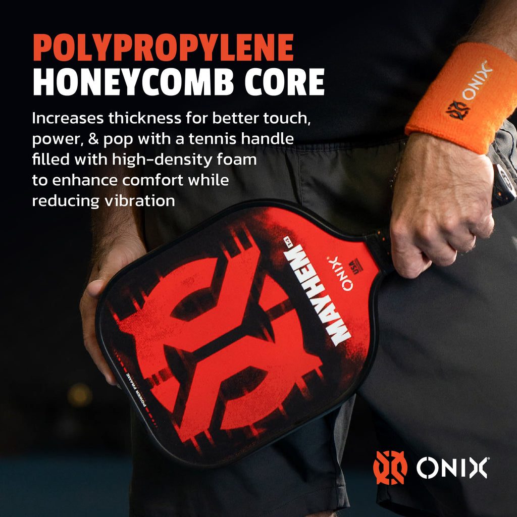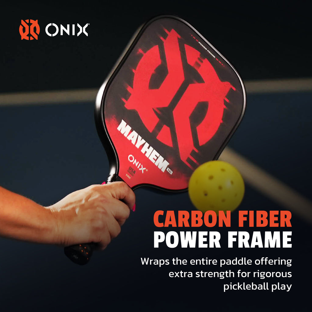 Introducing the most advanced pickleball paddle to the ONIX lineup, the Mayhem was technologically engineered to give you an edge on the court when you need it the most. The carbon fiber Power Frame wraps the entire paddle providing extra strength for the most rigorous pickleball play. The patented ThermoFused Technology molds the paddle to exact specifications. The tennis handle is filled with high-density foam to enhance comfort while reducing vibration. The Mayhem features a polypropylene honeycomb core insert for better touch, power, and pop. Experience the unmatched performance power in a medium-weight paddle weighing 7.8-8.2 oz. with a composite face. Choose between the 14mm and the 16mm style of Mayhem pickleball paddles. The 14mm style is best for better control and the 16mm style is for maximum control. The ONIX premium perforated grip provides increased comfort, tackiness as well as shock absorption. The Mayhem paddles are pro performance paddles used often in professional pickleball tournaments. Play your best with ONIX Pickleball. Shop now!